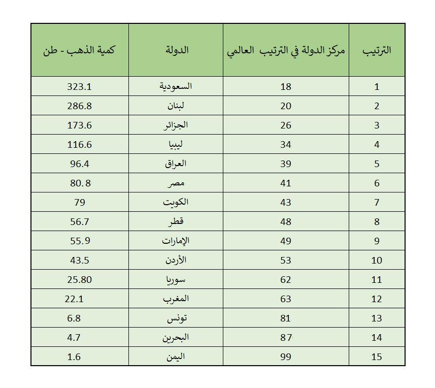 وفيما يلي جدول يظهر ترتيب الدول العربية باحتياطيات الذهب بناء على تقرير مجلس الذهب العالمي لشهر يناير 2022: