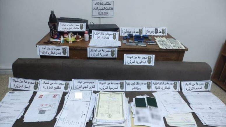 وبمزيد تعميق التّحرّيّات، تمّ التّعرّف على هويّة المورّطيْن في تدليس الشّهادتيْن المدرسيّتين، وبتفتيش منزل الامرأة المذكورة، بعد التّنسيق مع النّيابة العموميّة، تمّ القبض عليها وحجز شهادة مدرسيّة مفتعلة (خاصّة بابنتها)، وقد قالت إنّها تحصّلت على الوثيقة المدلّسة (التي تمّ حجزها) من قبل شخص (المورّط الرّئيسي في عمليّة التّدليس موضوع قضيّة الحال)، الذي بتفتيش منزله، تمّ حجز حاسوبين محمولين وآلة طباعة ومجموعة من الطّوابع والوثائق المفتعلة (وثائق إداريّة وشهائد علميّة وشهائد عمل ونسخ من بطاقات التّعريف الوطنيّة وجوازات السّفر وشهائد تلقيح وشهائد جامعيّة وشهائد باكالوريا وشهائد تكوين مهني)، كما تمّ حجز 324 قرصا مخدّرا.
