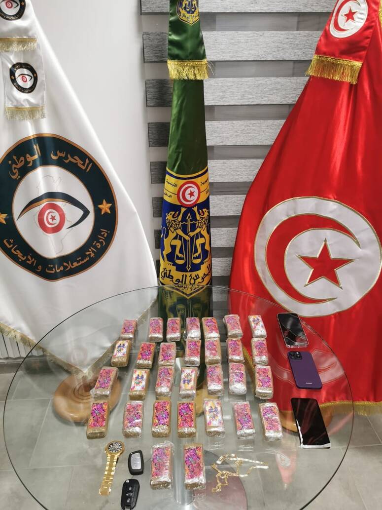 تمكّنت امس الوحدات المركزية بإدارة الإستعلامات والأبحاث للحرس الوطني بالعوينة بتاريخ 12/01/2024 من تفكيك شبكة مختصّة في الإتجار بالمواد المخدّرة تنشط بولايات تونس الكبرى، إحدى أطرافها محامية، أين تم حجز 30 صفيحة بنية اللّون يشتبه من كونها مادة "القنب الهندي" (زطلة) تزن حوالي 3 كلغ.