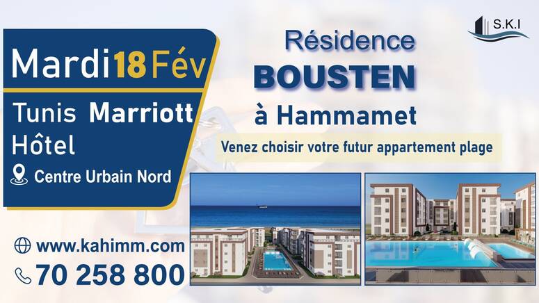 تدعوكم شركة كحلون العقارية لحضور حدث مميز لاكتشاف إقاماتها الفاخرة على الواجهة البحرية: إقامة بوستان في الحمامات وإقامة كوستا في سوسة، وذلك يوم الثلاثاء 18 فيفري 2025 بفندق ماريوت تونس – المركز العمراني الشمالي