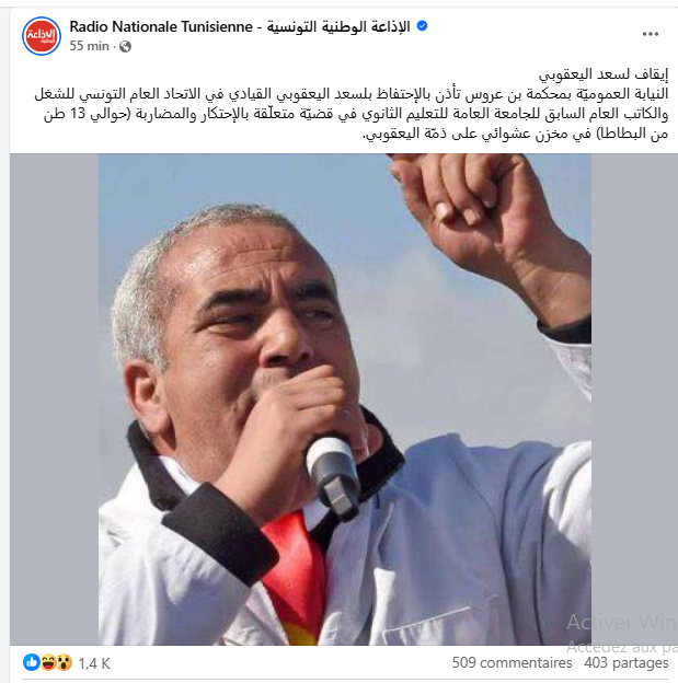 أفادت الإذاعة الوطنية التونسية أن النيابة العمومية بالمحكمة الابتدائية ببن عروس أذنت، اليوم، بالاحتفاظ بالقيادي في الاتحاد العام التونسي للشغل لسعد اليعقوبي، الكاتب العام السابق للجامعة العامة للتعليم الثانوي، في قضية تتعلق بالاحتكار والمضاربة.