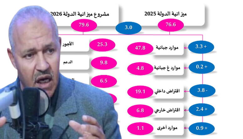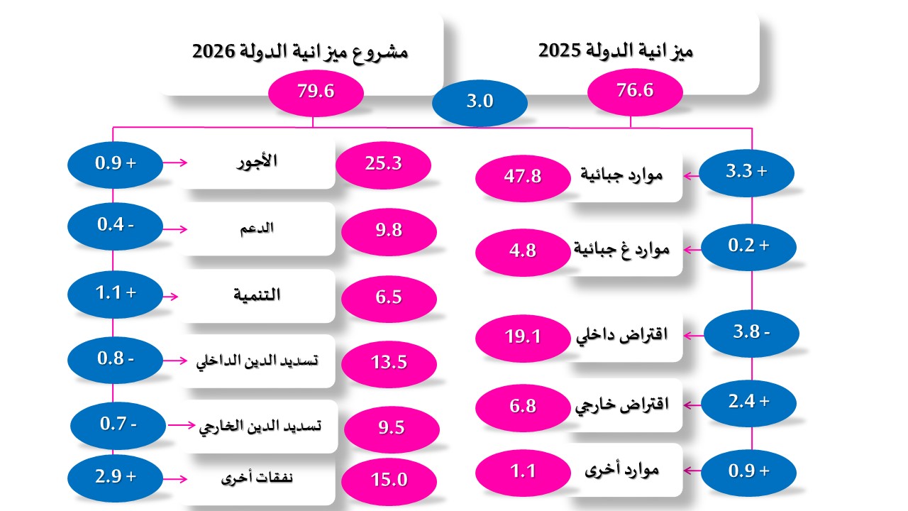 مشروع ميزانية الدولة لسنة 2026 : 79.6 مليار دينار مقابل 76.6 مليار دينار سنة 2025، أي بزيادة قدرها 3 مليارات دينار