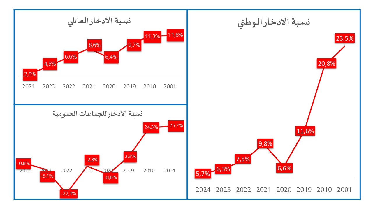 تكشف البيانات أن نسبة الادخار العائلي كانت مستقرة قبل الثورة (%11.6 سنة 2001 و%11.3 سنة 2010)، ثم تراجعت إلى %9.7 سنة 2019.غير أن الانحدار الأكبر سُجّل خلال السنوات الثلاث الأخيرة: