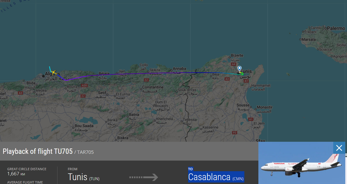 وكانت طائرة الخطوط التونسية في رحلتها من مطار تونس قرطاج الدولي إلى مطار محمد الخامس بالدار البيضاء.