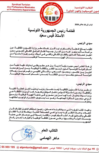 وفي الإطار ذاته، وجّهت النقابة التونسية للمهن الموسيقية والمهن المجاورة رسالة رسمية إلى رئيس الجمهورية، الأستاذ قيس سعيّد، عبّرت فيها عن بالغ دهشتها واستغرابها من قرار إخلاء مقر وزارة الشؤون الثقافية، معتبرة أنّ هذا المقرّ ليس مجرّد بناية إدارية، بل معلم وطني ارتبط بأسماء بارزة أسّست للفكر والثقافة الوطنية، وأسهم في ترسيخ السيادة الثقافية للدولة.