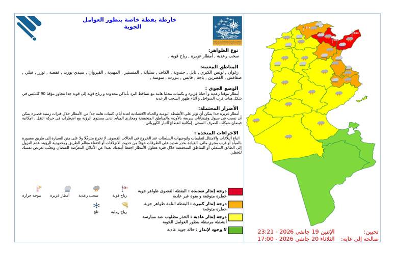 قام المعهد الوطني للرصد الجوي، ليلة الاثنين 19 جانفي، بتحيين خارطة اليقظة الجوية الخاصة بتطوّر العوامل المناخية، حيث تمّ إدراج تونس الكبرى والوطن القبلي (نابل) ضمن درجة إنذار شديدة، مع توقع ظواهر جوية خطيرة.