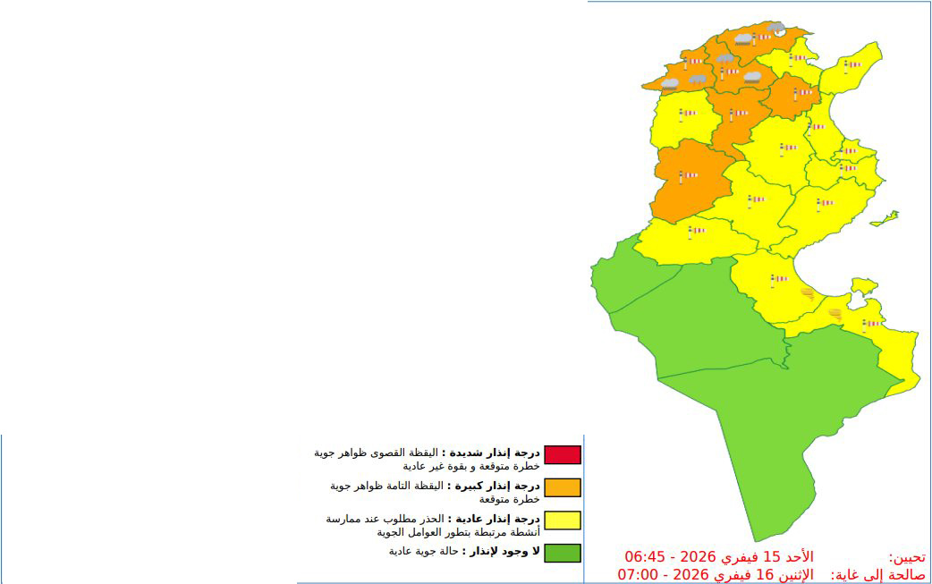 أسند المعهد الوطني للرصد الجوي اللون البرتقالي لست ولايات اليوم الأحد، في إطار خريطة اليقظة الخاصة بمتابعة التقلبات الجوية. وتشمل درجة الإنذار المرتفعة ولايات بنزرت، جندوبة، باجة، زغوان، سليانة والقصرين، مع توقع هبوب رياح قوية جدا قد تبلغ سرعتها القصوى بين 90 و100 كلم/س، مع إمكانية تجاوزها محليا إلى حدود 105 أو 110 كلم/س.