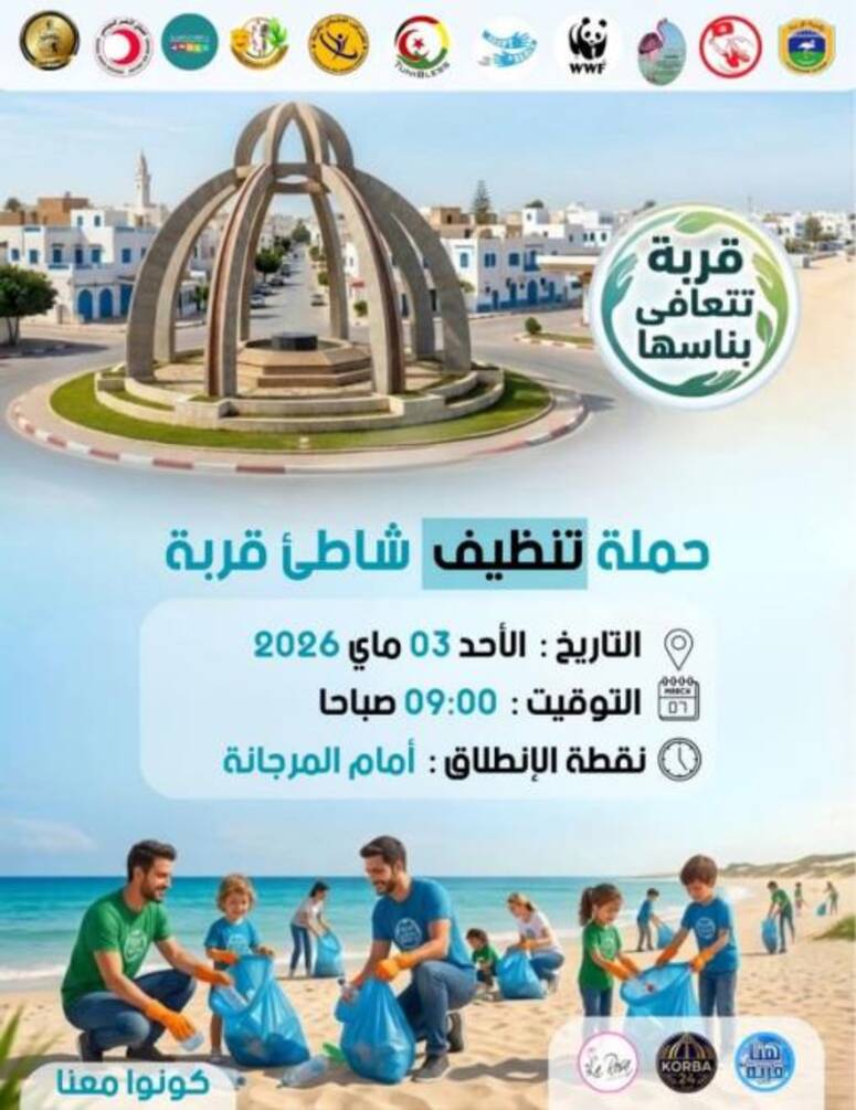 أعلنت الجمعية التونسية لحماية الطبيعة والبيئة بقربة ATPNE، عن اطلاق مبادرة بيئية مشتركة لتنظيف شاطىء قربة يوم الأحد 3 ماي المقبل، على الساعة التاسعة صباحا أمام المرجانة